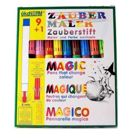 The Magic Pens come in bright colours, the barrels show the colour of the ink, and can be used on many different surfaces, such as paper, cardboard, wood etc. Going over the lines or areas drawn or filled with the magic pens with the white coloured changing pen change the colours – as if by magic – to the colour shown on the cap of the pens. The colour changing pen can also be used like invisible ink; anything written or drawn with it becomes visible only if it is painted over with a magic pen.