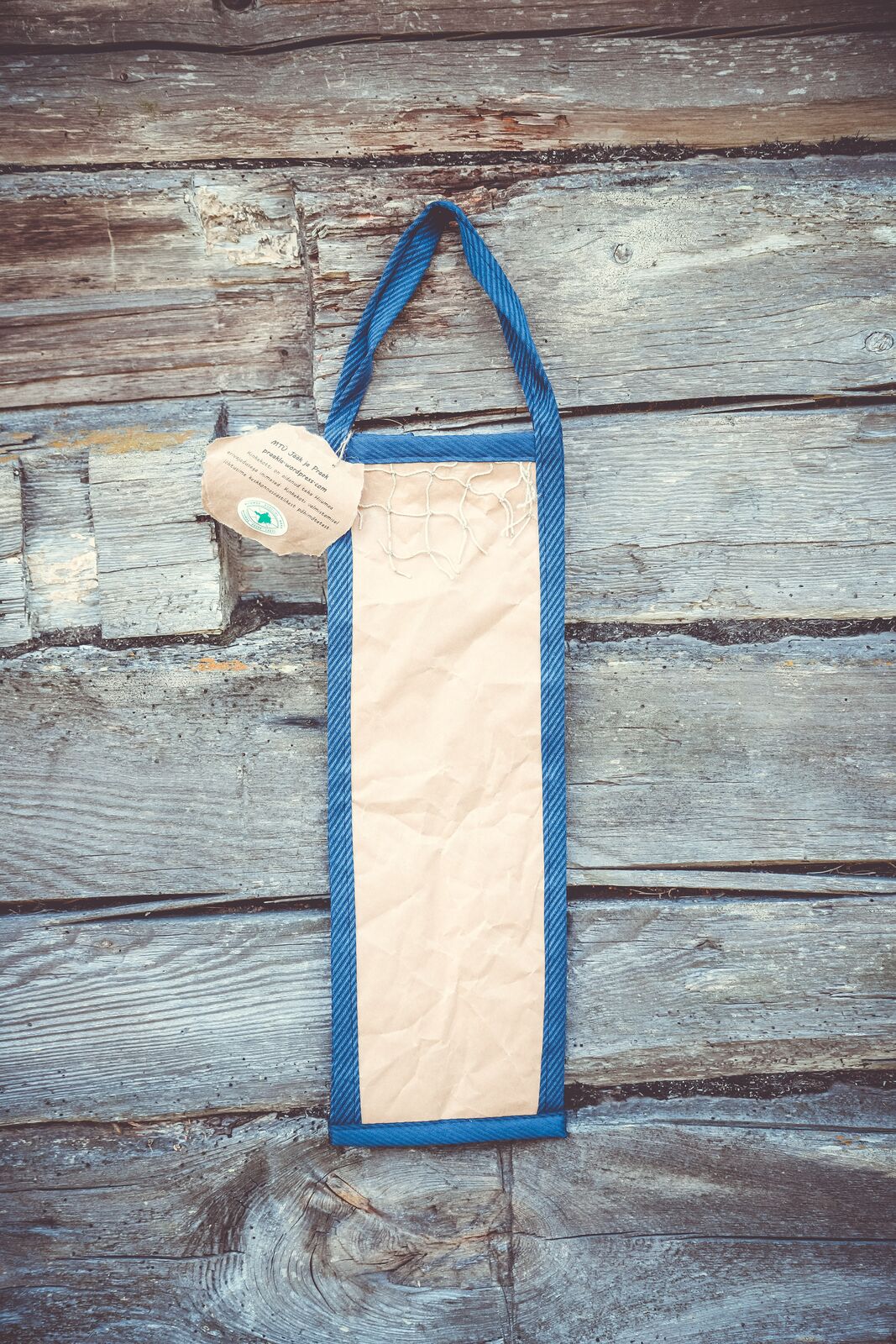 Детали из ткани могут быть разных цветов: серые, белые, темно-серые, светло-серые. Бумажная часть пакета – это смятая и покрытая изнутри пленкой крафт-бумага. Для украшения используются вырезанные из списанных книг библиотеки Хийумаа элементы (рыба, цветок и т.д.). Каждая сумка оригинальна и уникальна.