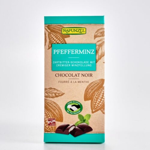 Koostisosad: poolmõru šokolaad* 60% (kakaomass*, roosuhkur*, kakaovõi*, emulgaator: sojaletsitiin*, Bourbon vanilje*), pipar- münditäidis* 40% [(suhkrupasta: roosuhkur*, glükoosisiirup*, vesi), invertsuhkrusiirup*, piparmündiõli*]. *Kontrollitud mahepõllumajandusest. Kakaosisaldus vähemalt 60%. Võib sisaldada pähklite ja piima jääke.