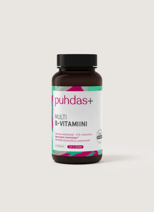 Puhdas+ Multi B-vitamiini on toidulisand, mis aitab hoida energiataset, toetada närvisüsteemi ja tulla toime igapäevase stressiga. B-grupi vitamiinid on keha jaoks hädavajalikud, sest need aitavad muuta toidust saadava energia organismile kasutatavaks „kütuseks“. Lisaks osalevad need vitamiinid närvisüsteemi töös, ajutegevuses ning aitavad kaasa väsimuse ja kurnatuse vähendamisele.