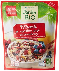 Koostisosad: rukkihelbed*, rosinad* 15% (rosinad*, päevalilleõli*), nisuhelbed*, jõhvikad* 10% (jõhvikad*, roosuhkur*, päevalilleõli*), maisihelbed, mustikad* 3% (mustikad*, roosuhkur*, päevalilleõli*), goji marjad* 2%.